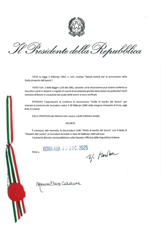 Stella al Merito alla Memoria per 185 minatori italiani morti, il 28 febbraio 1940, nella sciagura mineraria di Arsia, oggi Rasa (Croazia). È stata la più grande catastrofe mineraria italiana. Il Presidente della Repubblica Sergio Mattarella il 30 dicembre 2025 ha firmato il relativo decreto, controfirmato dalla Ministra del Lavoro Calderone. Decreto che è stato pubblicato sulla Gazzetta Ufficiale. Ora il Ministero degli Esteri e quello del Lavoro stanno organizzando per il prossimo 28 febbraio una manifestazione per ricordare la sciagura e consegnare le Stelle alla Memoria.